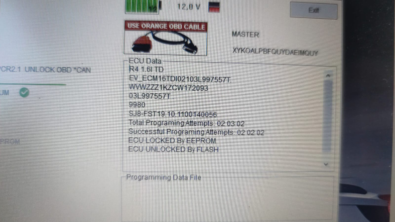 2.Write file selecting complete. it will stop at 6%, reboot the writing and then, at 6% again, it ask you to remove the key 120s, then unplug the battery 60s, then plug it 60s and then press ok before turning on ignition. it will resume and will take about 20 min
