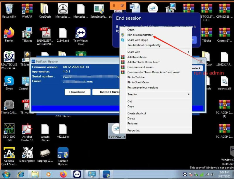 Set padflashr.exe always run as admin (after set it as admin , then run it as admin mode , it will display a windows ask you input the sn ,so you write your tools big letters sn in it. then login)